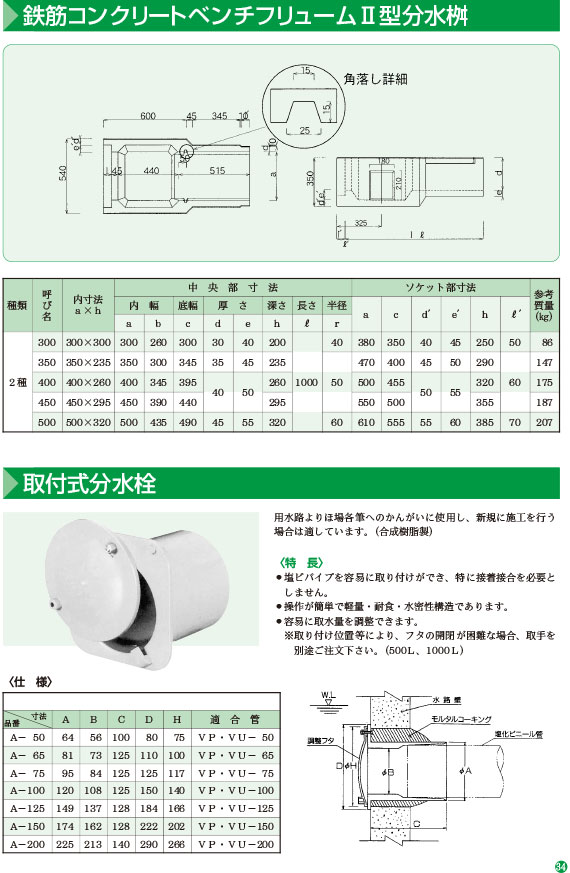 鉄筋コンクリートベンチフリュームU型分水桝・取付式分水栓
